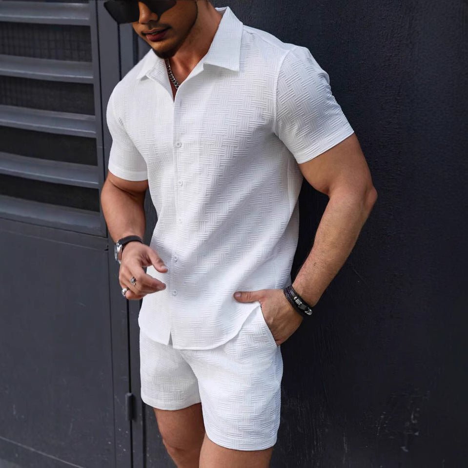 Leisure Breathable Beach Two Piece Suits Mens Summer Casual Short Sleeve Shirt And Shorts Men Outfits Vintage Textured Solid Set